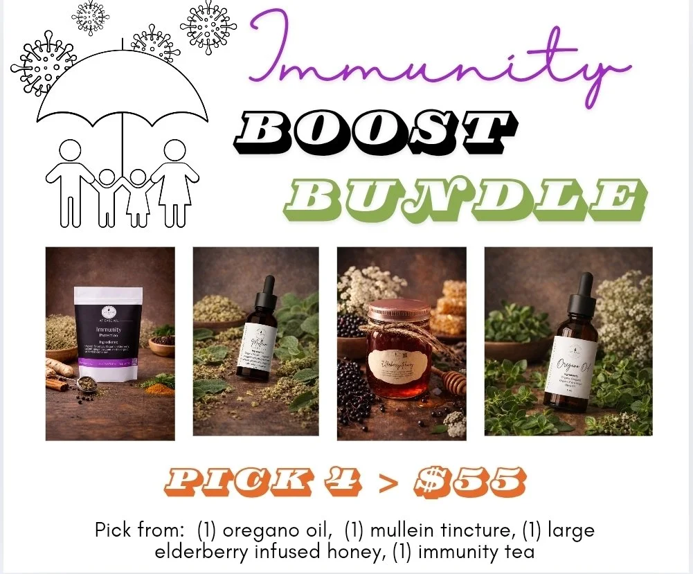 Inside, you’ll find a warming Elderberry Immunity Tea to nourish and fortify daily immunity, Elderberry Infused Raw Honey to soothe the throat and provide antioxidant-rich support, Oregano Oil for targeted immune defense when the body feels compromised, and Mullein Tincture to support the lungs, ease congestion, and promote clear breathing.